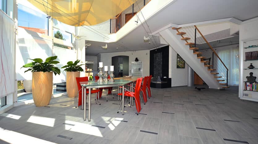 Ein kleiner Steg führt Sie über den Gartenteich zur Eingangstür des Hauses. Der Blick auf den asiatisch anmutenden Wasserfall im Garten beruhigt beim Heimkommen den Pulsschlag. Um den freundlich wirkenden Eingangsbereich mit repräsentativer Garderobe gruppieren sich der hausinterne Zugang zum Untergeschoss sowie eine Gästetoilette. Automatisch fällt der Blick auf die filigrane Mittelholmtreppe ins Obergeschoss, deren raffinierte Konstruktion suggeriert, sie würde frei im Raum schweben. Dahinter liegt der offen gestaltete Wohn- und Essbereich. Über dem Essplatz öffnet sich ein Luftraum. Die wintergartenähnliche Verglasung umfasst beide Stockwerke sowie den Dachbereich und holt nicht nur den Garten, sondern auch die Sterne ins Innere. Elektronisch steuerbare Segel erlauben die perfekte Abstimmung des Lichteinfalls auf die Bedürfnisse der Bewohner. Neben der hauseigenen Bar ist die Küche mit dazugehörigem Haushaltsraum untergebracht. Sie überzeugt durch ihre durchdachte und hochwertigste Ausstattung. Massgefertigte Elemente ermöglichen eine flexible Nutzung.