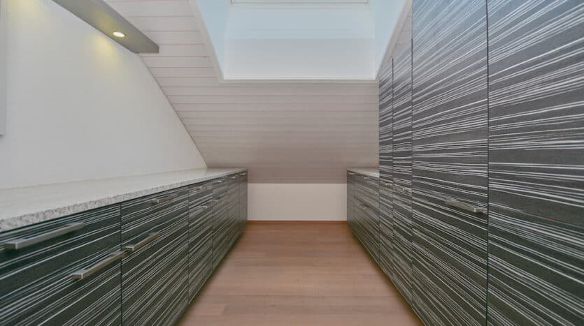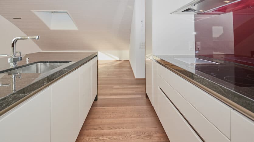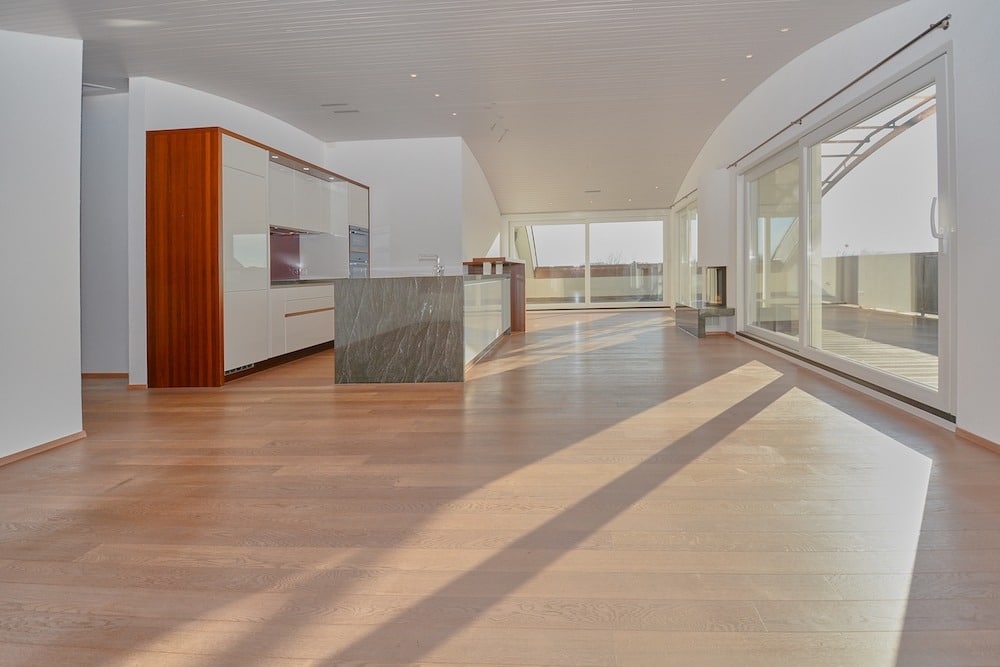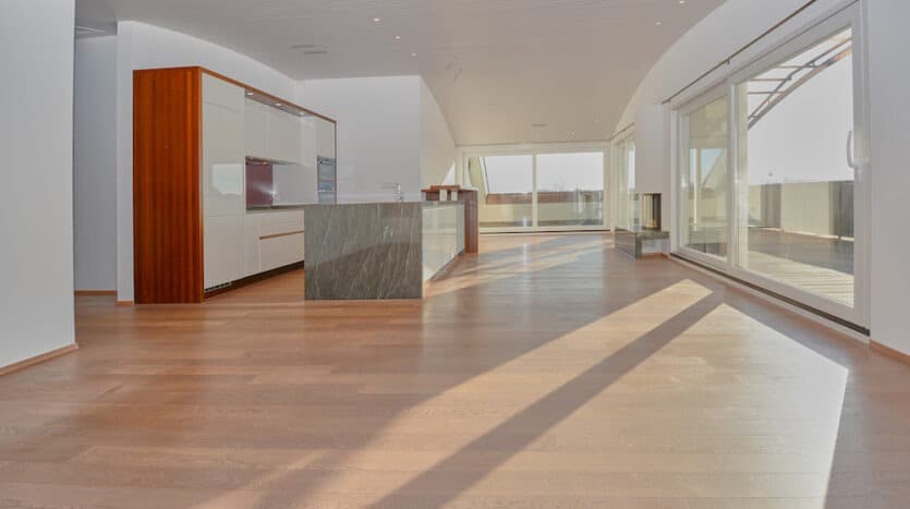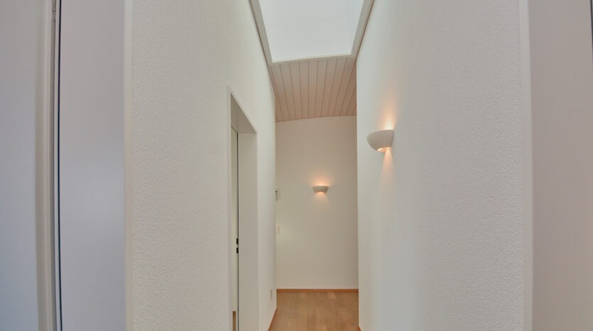 Die Attikawohnung ist rollstuhlgängig und das beginnt schon beim Zugang. Erster Pluspunkt: nebst dem Wohnungszutritt über das Treppenhaus führt auch ein Lift direkt in die Wohnung. Beim Betreten fallen sofort die überdurchschnittlichen Raumhöhen und die gewölbte Decke auf. Das extensiv begrünte Tonnendach beeinflusst das Raumklima der direkt darunterliegenden Räume positiv. Bereits jetzt ist klar: in diesen Innenausbau wurde mit Geschmack, höchster Qualität und Liebe zum Detail investiert. Vom Eingangsbereich aus führt ein Korridor in verschiedene Richtungen. Folgt man dem Lichteinfall, so geht man den Korridor entlang, vorbei an der Waschküche und dem Haus-haltsraum in edlem Design mit viel Stauraum. Schliesslich mündet der Flur im offenen Wohn- Ess- und Kochbereich.