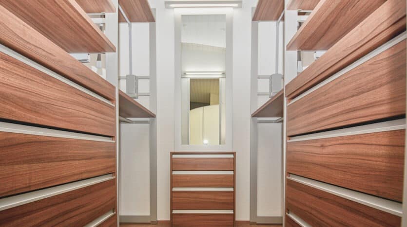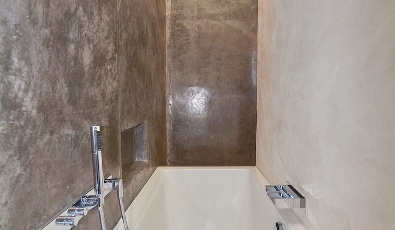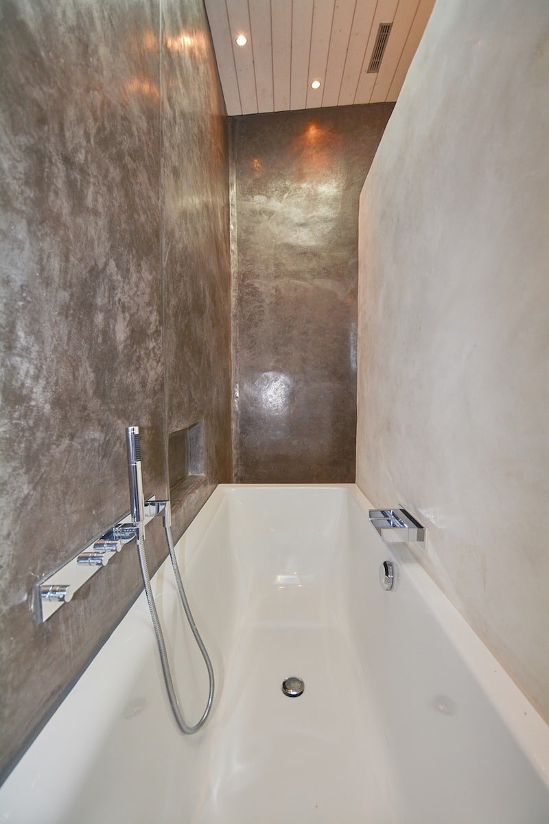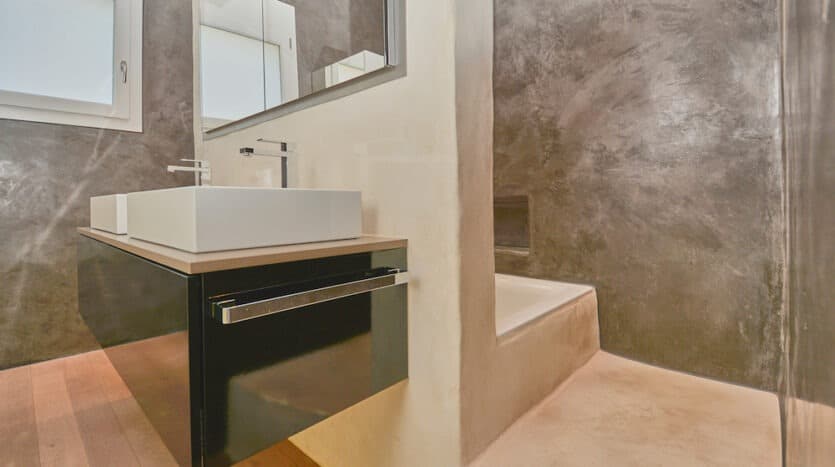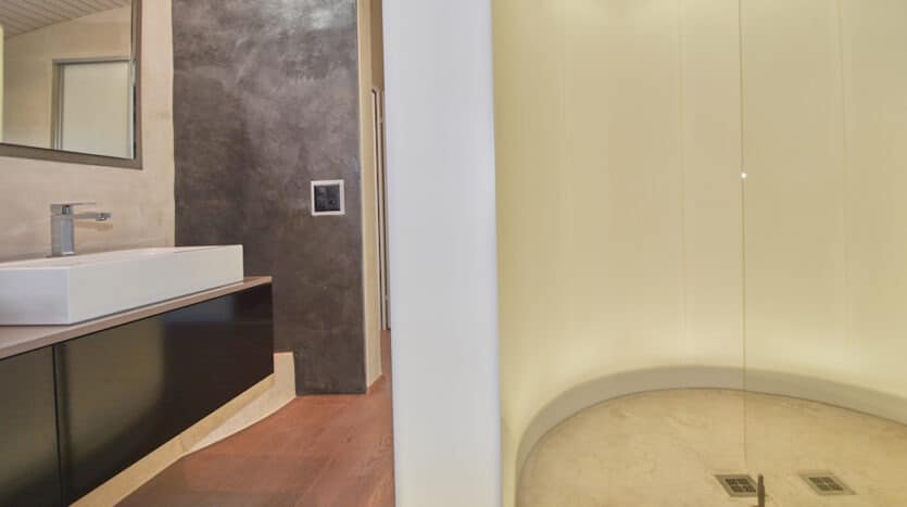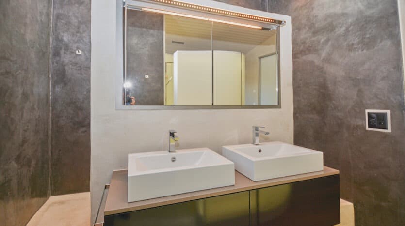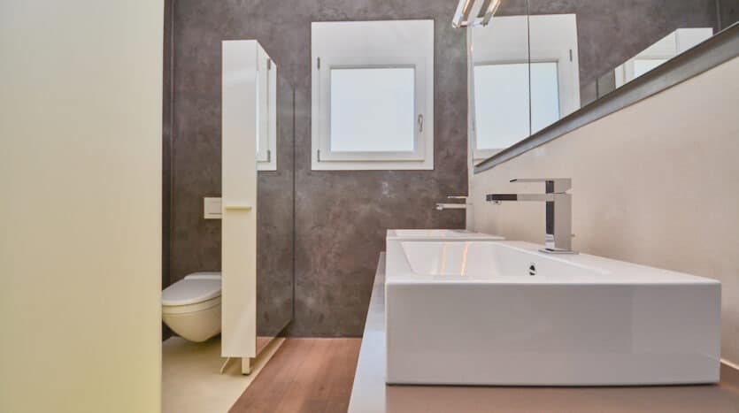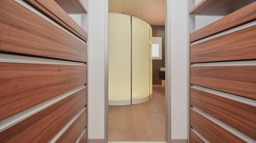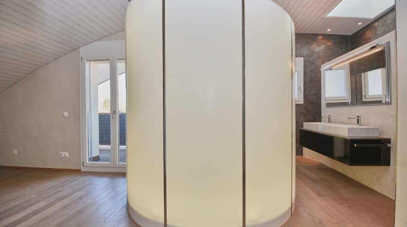 Im nordöstlichen Eck der Wohnung, am Ende des Flurs gelegen, ist die weitläufige Nasszone mit separatem Balkon angelegt. Auch schlaftrunken am Morgen findet man in die grosse Runddusche ohne irgendwo anzustossen. Ein Geberit Dusch-WC, zwei Aufsetzlavabos und dahinter, in einem eigenen Trakt, die Badewanne, erfüllen funktionale Ansprüche gleichermassen wie ästhetische. Auch eine Ankleide in edler Ausführung fehlt nicht.