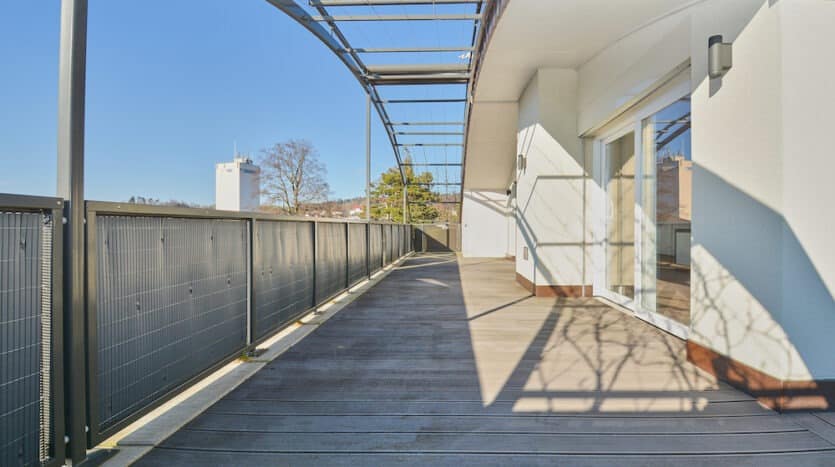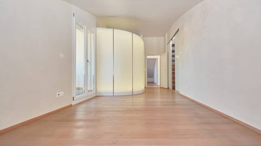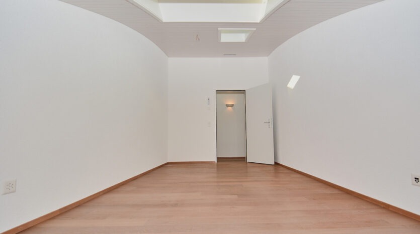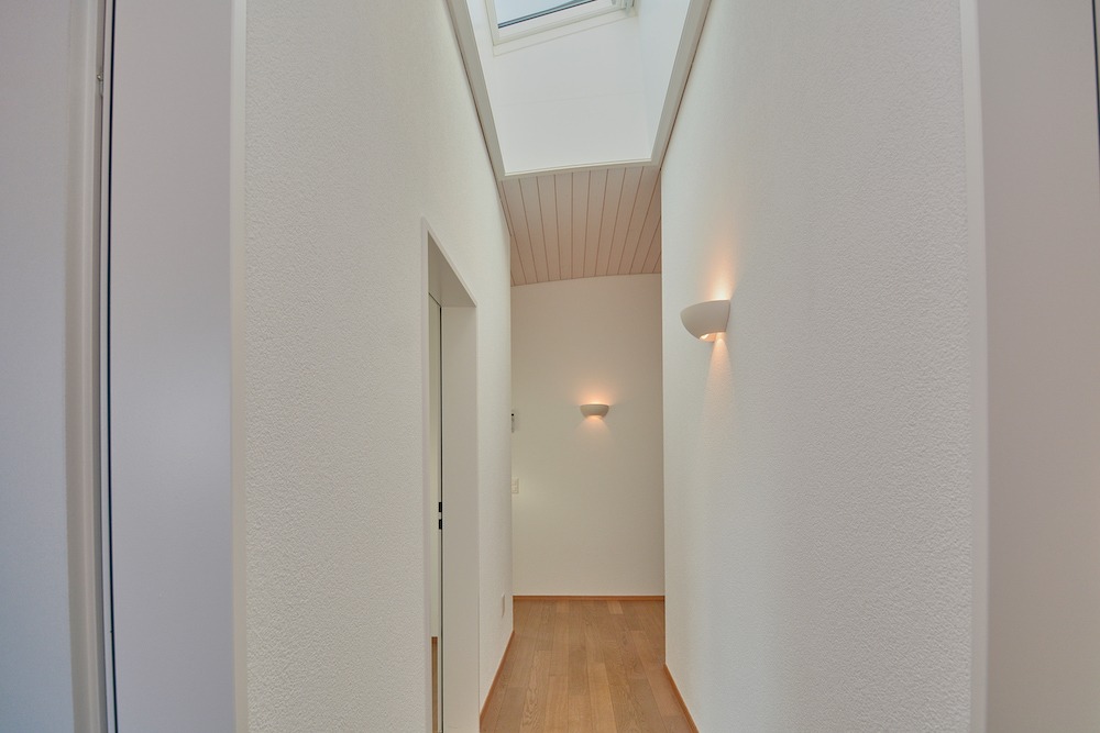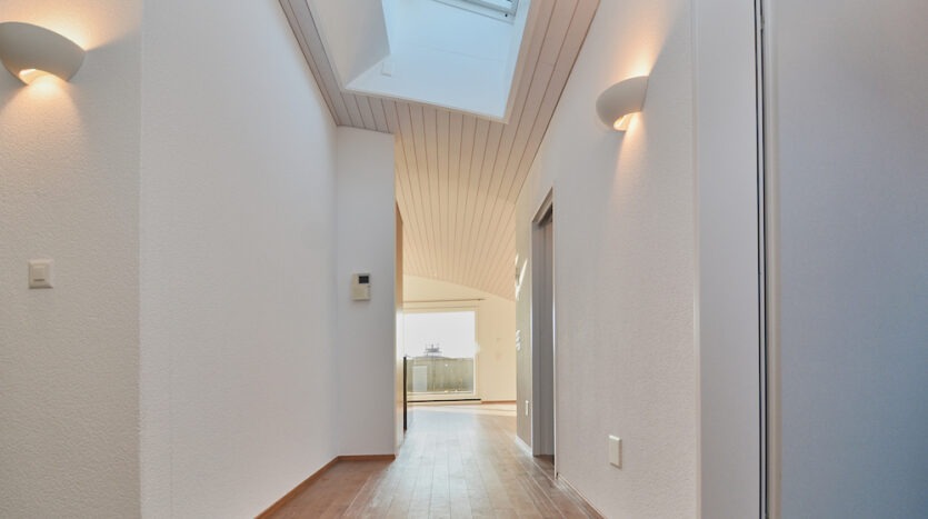 Vom Entrée aus dient ein L-förmiger Korridor als Verbindung zu den Privaträumlichkeiten. Ein Ba-dezimmer mit Badewanne, Dusche und Doppellavabo befindet sich gleich neben dem Liftzugang. Danach sind auf einer Sichtachse drei sehr geräumige Schlafzimmer untergebracht. Das dritte unter ihnen verfügt über eine Fensterflügeltüre mit Zutritt zu einem eigenen Balkon. Dank der bemerkenswerten Raumhöhen sind die Zimmer gut möblierbar. Grossflächige Dachfenster sorgen für viel Tageslicht.
