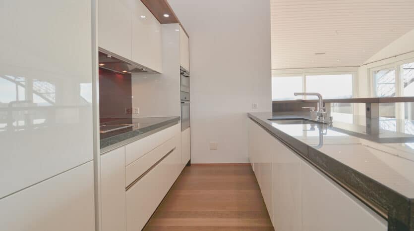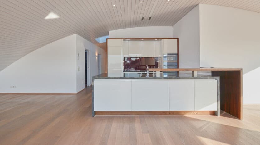 Die offene Küche in weiss präsentiert sich in modernem Hochglanz-Look und fügt sich optisch harmonisch ins Raumgefüge ein. Sie ist qualitativ top ausgerüstet und verfügt über grosse Arbeitsflä-chen. Der eingebaute Teppanyaki Grill bietet erweiterte Kochmöglichkeiten. Um die Küche er-streckt sich der weitläufige Wohn- und Essbereich, der durch die imposante Raumhöhe und die riesigen Fensterfronten ein luftig-leichtes Wohngefühl vermittelt.